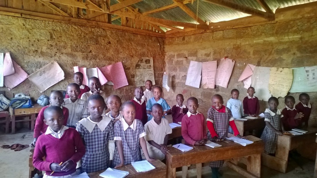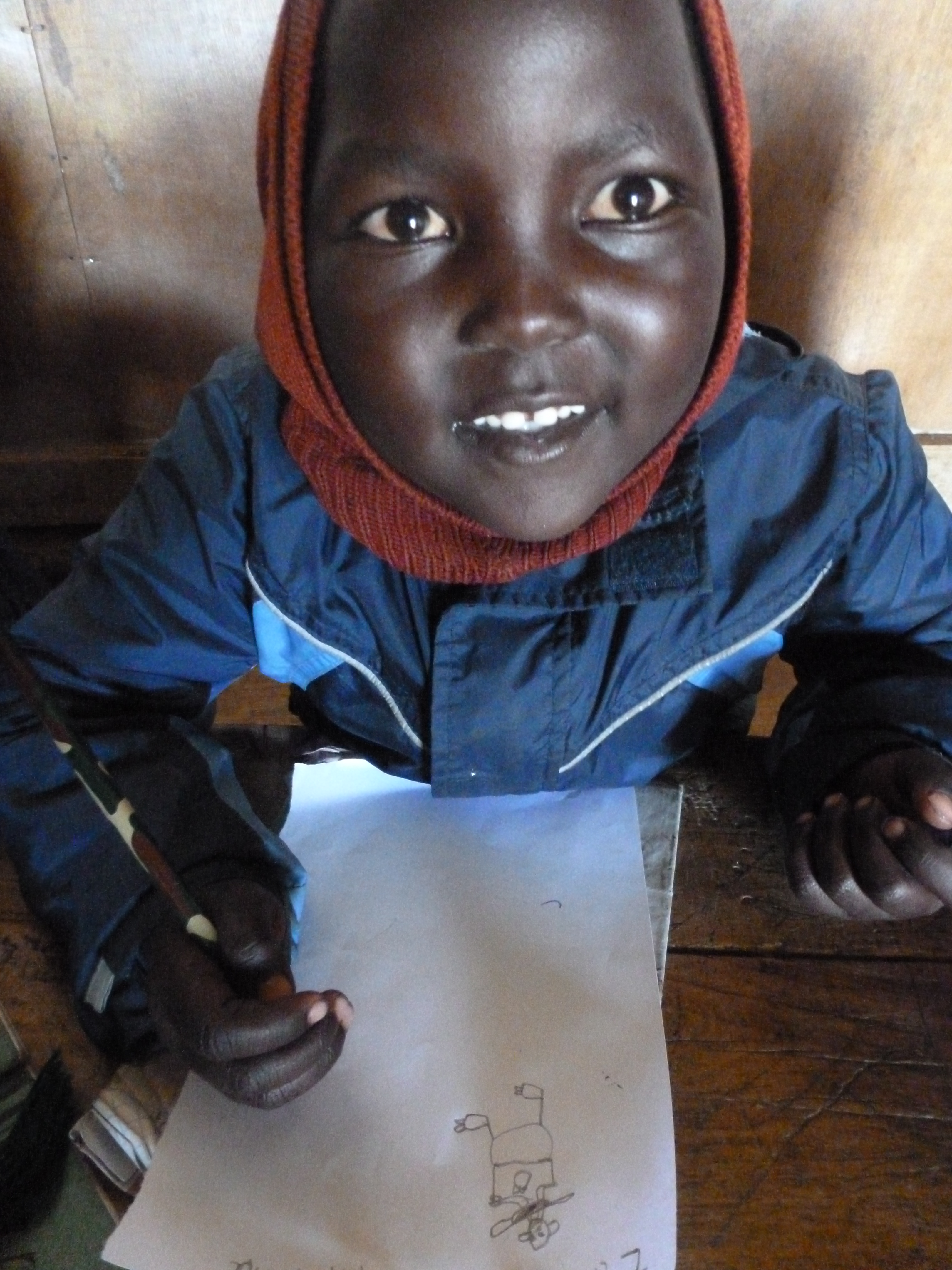 A student in the “Pre-Unit” or preschool class at Mwicwiri Primary School in Kenya draws pictures with paper and pens donated by Southern Illinois University students who were visiting the school. Small gifts such as these make a huge impact on the lives of young children in Kenya.